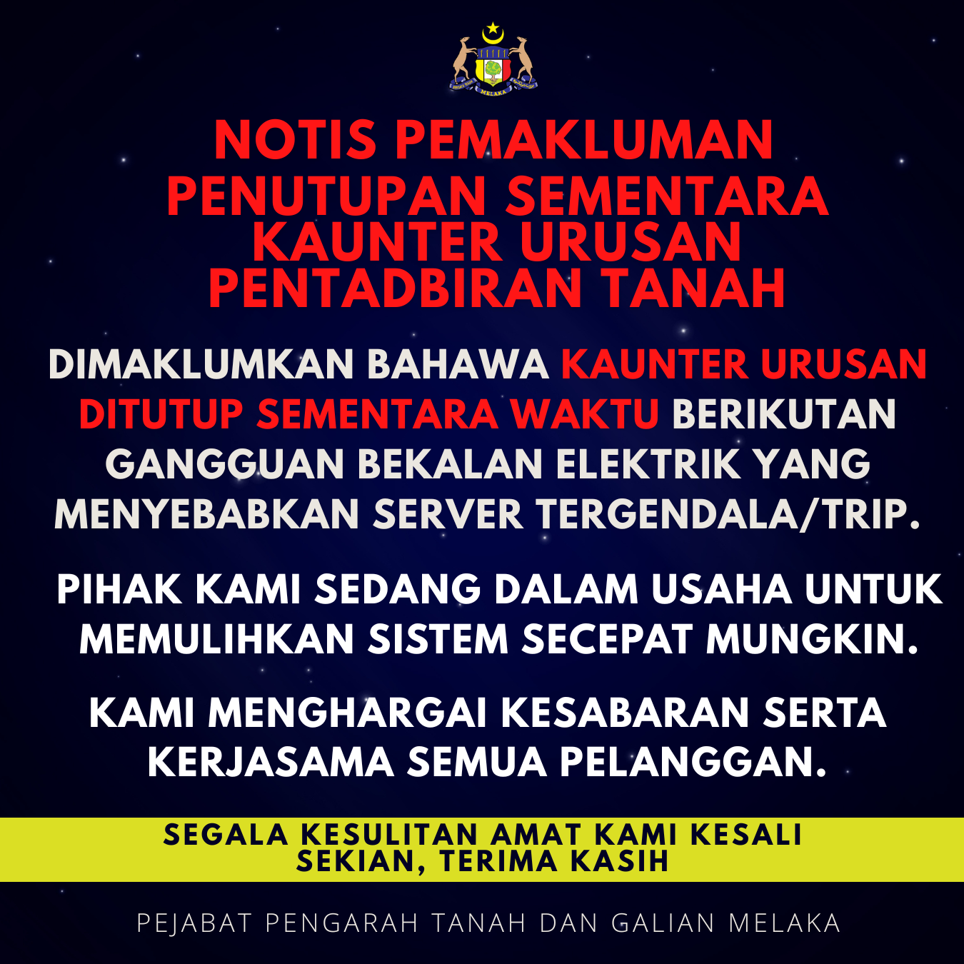 PENUTUPAN OPERASI KAUNTER PENTADBIRAN TANAH NEGERI MELAKA , KAUNTER KUTIPAN UTC, PBAYARAN CUKAI TANAH DAN CARIAN PERSENDIRIAN ONLINE